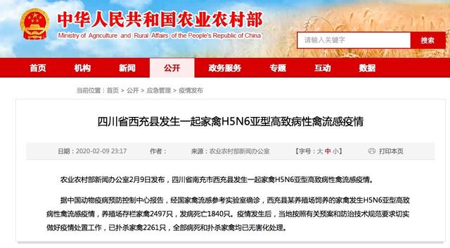 從農(nóng)業(yè)農(nóng)村部網(wǎng)站了解到,農(nóng)業(yè)農(nóng)村部新聞辦公室2月9日發(fā)布,四川省南充市西充縣發(fā)生一起家禽H5N6亞型高致病性禽流感疫情。