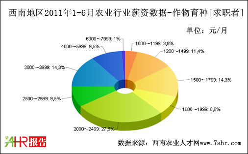 2011年上半年,西南地區(qū)作物育種求職期望薪資主要集中于1500-1799,2000-2499,3000-3999區(qū)間,其中2000-2499最多,占整個(gè)數(shù)據(jù)的27.6%,1500-1799,3000-3999區(qū)間均占14.3%,月薪2000以上達(dá)61.9%,月薪3000以上占24.8%。